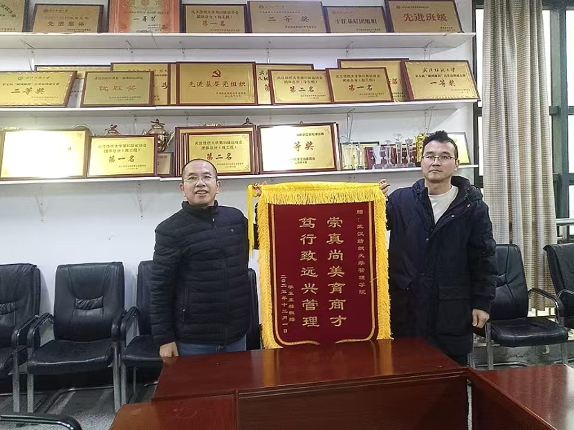 12月2日下午,武汉纺织大学管理学院迎来了一位特殊的访客——财务管理专业2011级校友王稀。在毕业十年之际,他手持两面锦旗重返母校,将“崇真尚美育商才,笃行致远兴管理”赠予学院。吴金红院长接受锦旗,这十六个字背后,是一代代管院人践行的教育哲学。吴院长还对校友的返校表示感谢,邀请校友多支持学校和就业和校企合作,推动学院的高质量发展。