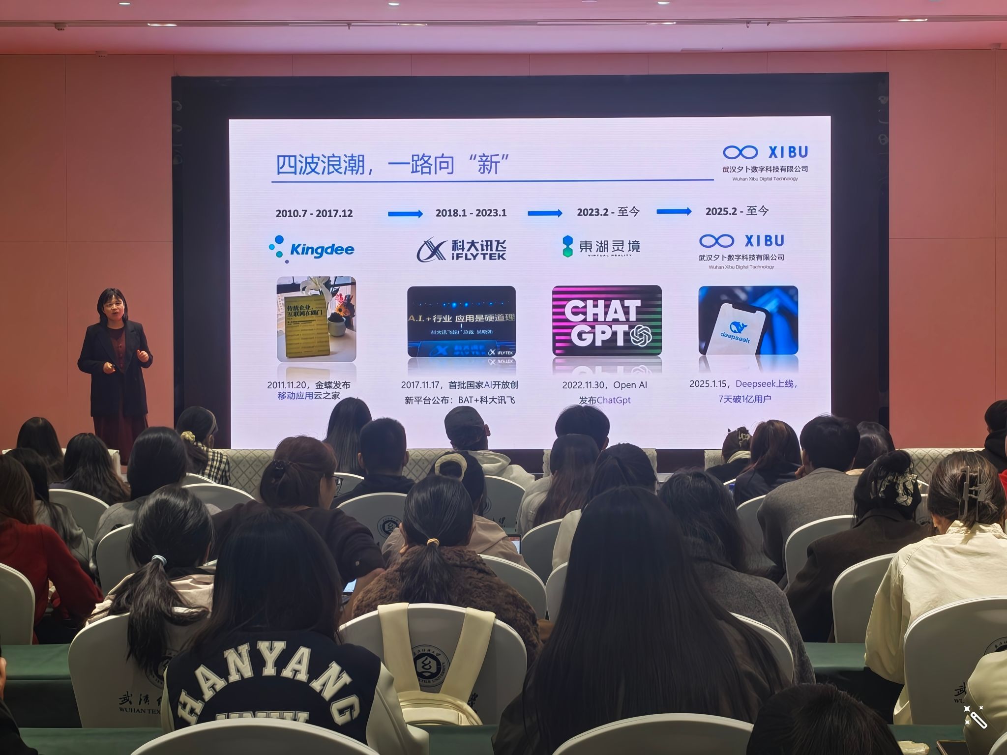 10月30日下午,管理学院在建全会堂全棉时代厅举办了“AI时代的极简创业法则”专题讲座。本次讲座邀请湖北省数字内容服务行业协会执行会长、大模型领域连续创业者任婷女士主讲,管理学院执行院长吴金红、副院长周磊以及200余名学生代表参加了此次活动。
