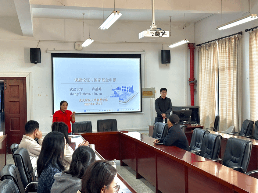 2025年11月5日,管理学院在崇德楼536举办武汉纺织大学第863期阳光论坛暨课题论证与国家基金申报指导交流会。本次会议邀请到武汉大学卢盛峰教授进行指导。此次讲座旨在提升青年博士在课题论证和基金申报方面的能力,进一步推动学院科研工作的发展。