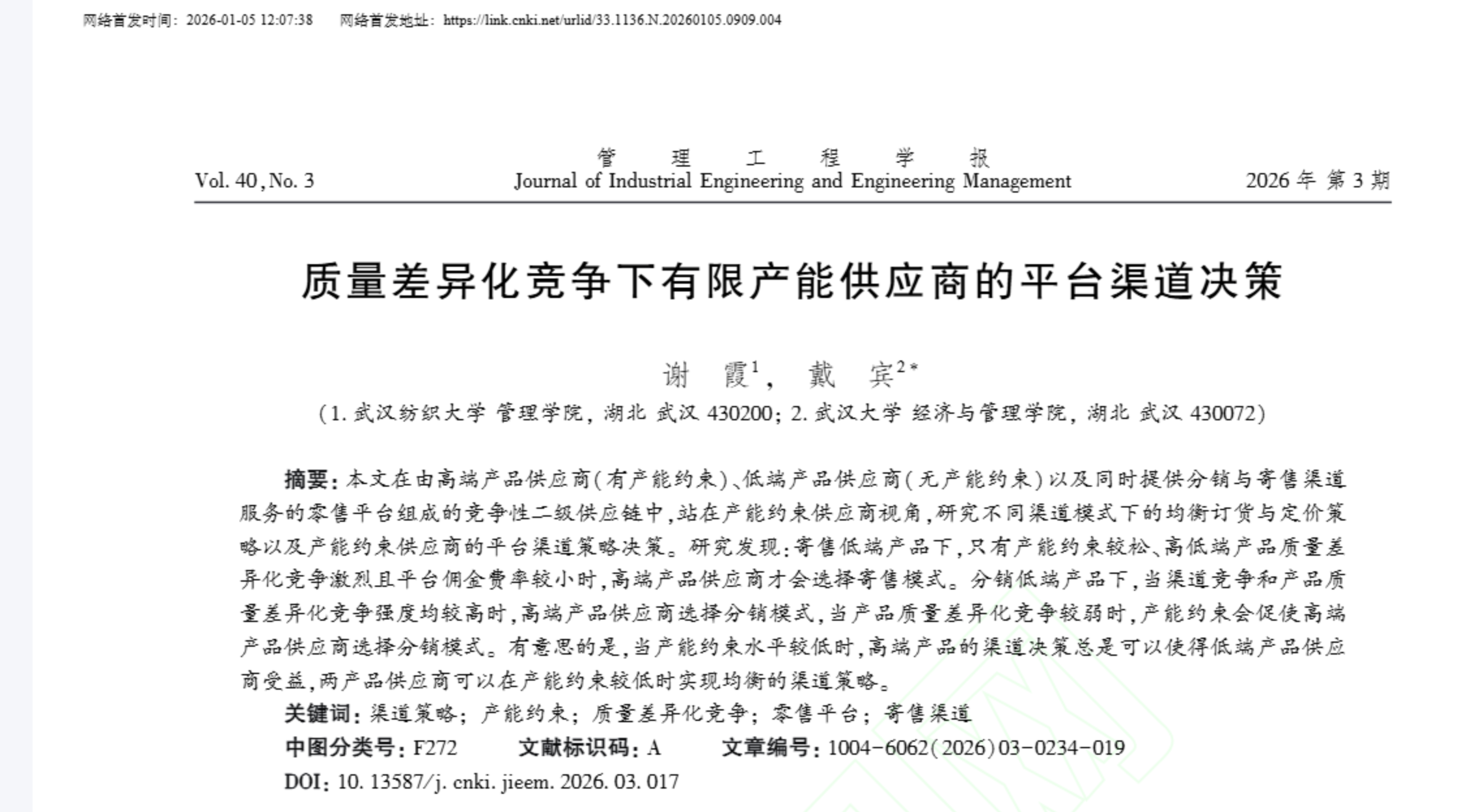 2026年1月5日,管理科学领域重要期刊《管理工程学报》官网上网络首发了我院谢霞副教授的学术论文《质量差异化竞争下有限产能供应商的平台渠道决策》。该论文探讨了产能约束、渠道竞争和质量竞争对供应商平台渠道策略的交互作用机制。该研究是谢霞副教授国自科基金资助项目的阶段性研究成果。武汉纺织大学管理学院谢霞副教授为该论文第一作者,武汉大学经济与管理学院戴宾教授为该论文的通讯作者。