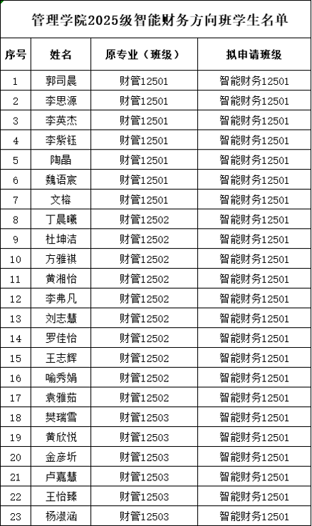 根据《管理学院“智能财务方向班”选拔与管理办法》,经学生自愿报名、资格初审、综合考核(笔试/面试)等环节,现将拟录取进入“智能财务方向班”的学生名单(共23人)予以公示。