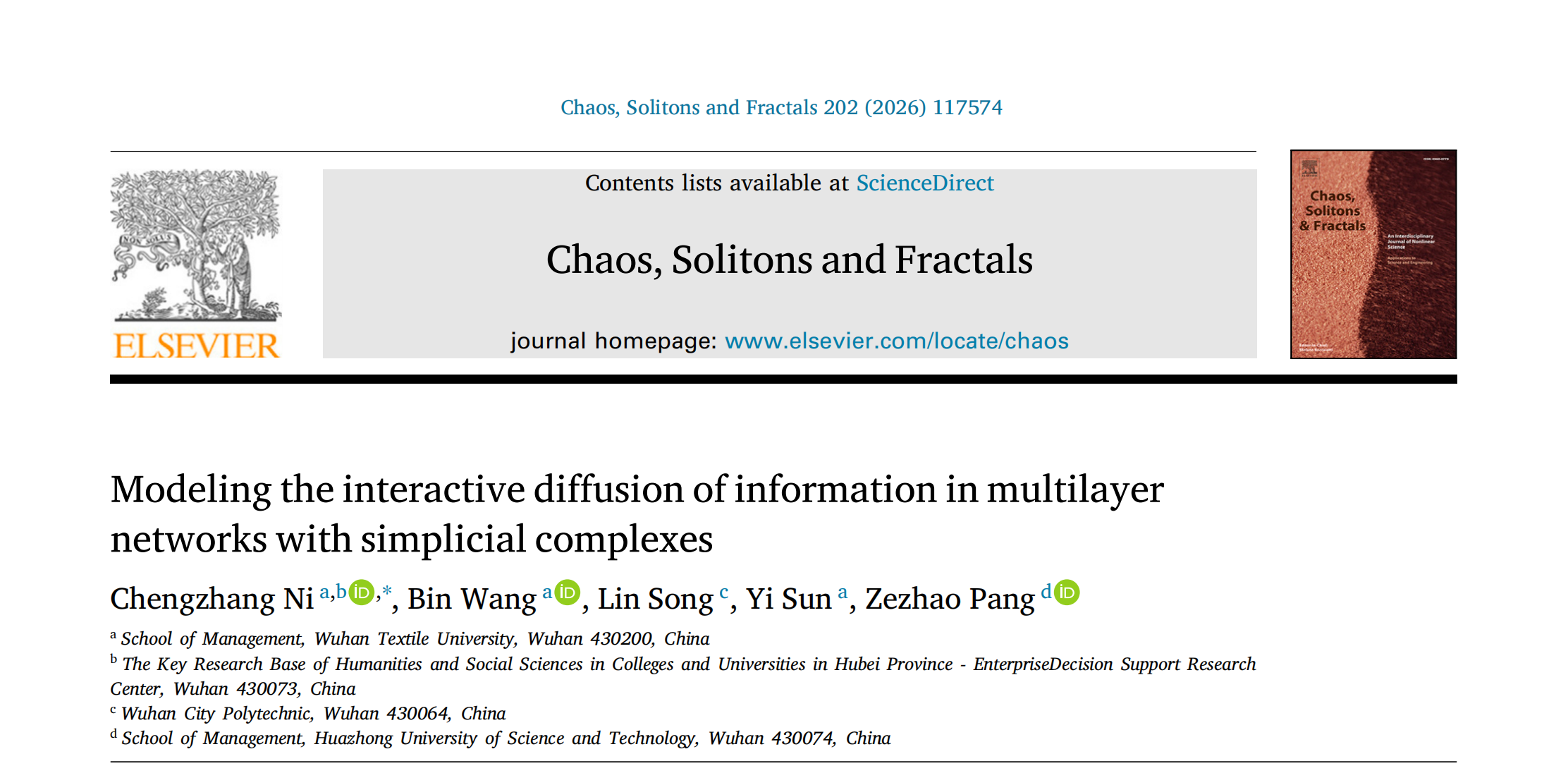 近日,交叉学科国际权威期刊《Chaos, Solitons and Fractals》发表了武汉纺织大学管理学院倪成章副教授为第一作者和通讯作者的研究论文《Modeling the interactive diffusion of information in multilayer networks with simplicial complexes》。武汉纺织大学管理学院为该论文的第一单位,武汉纺织大学管理学院孙昳副教授、硕士研究生王彬是论文的共同作者。
