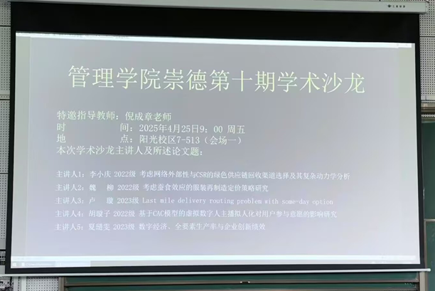 2025年4月25日上午,管理学院第10期“崇德”学术沙龙分别在阳光校区7-513和7-536教室如期举行。本次学术沙龙由10位主讲人进行学术分享,特邀倪成章老师和丁校洁老师担任指导老师。