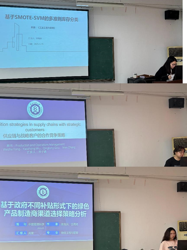 分会场7-536教室,宋琬婷同学介绍了《基于SMOTE-SVM的多准则库存分类》,提出了一种改进的库存分类模型。洪子涵同学分享了《Co-opetition strategies in supply chains with strategic customers》,分析了制造商与原始设备制造商之间的竞合策略。高旻同学探讨了《基于政府不同补贴形式下的绿色产品制造商渠道选择策略分析》,研究了政府补贴对制造商渠道选择的影响。