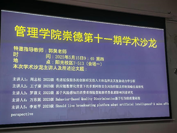 2025年5月15日上午,管理学院第11期“崇德”学术沙龙分别在阳光校区7-513和7-536教室如期举行。本次学术沙龙特邀郭昊老师和李静雯老师担任指导老师,对10位主讲人的学术分享进行点评。