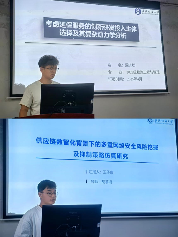分会场7-513教室,周志松同学汇报了论文《考虑延保服务的创新研发投入主体选择及其复杂动力学分析》,探讨了延保服务背景下供应链中创新研发投入主体的选择问题。王子康同学聚焦于《供应链数智化背景下的多重网络安全风险挖掘及抑制策略仿真研究》,通过多种文本挖掘方法分析了供应链网络安全风险及其抑制策略。