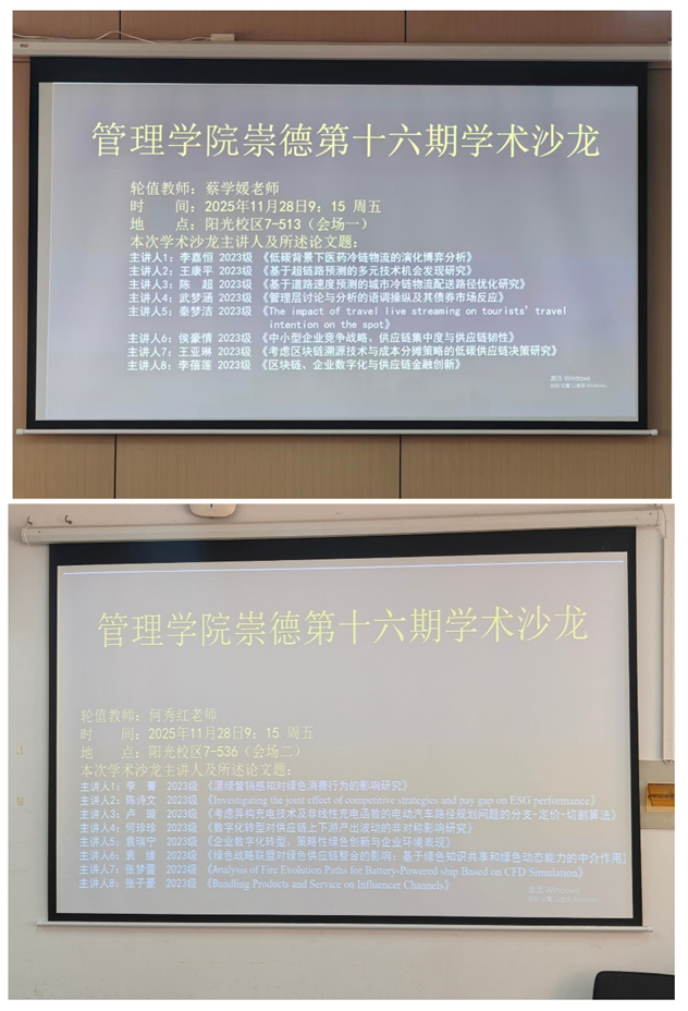 2025年11月28日上午,管理学院第16期“崇德”学术沙龙分别在阳光校区7-513教室和7-536教室如期举行。本次沙龙特邀蔡学媛老师和何秀红老师担任评委老师,对16位主讲人最新的学术研究分享进行点评。