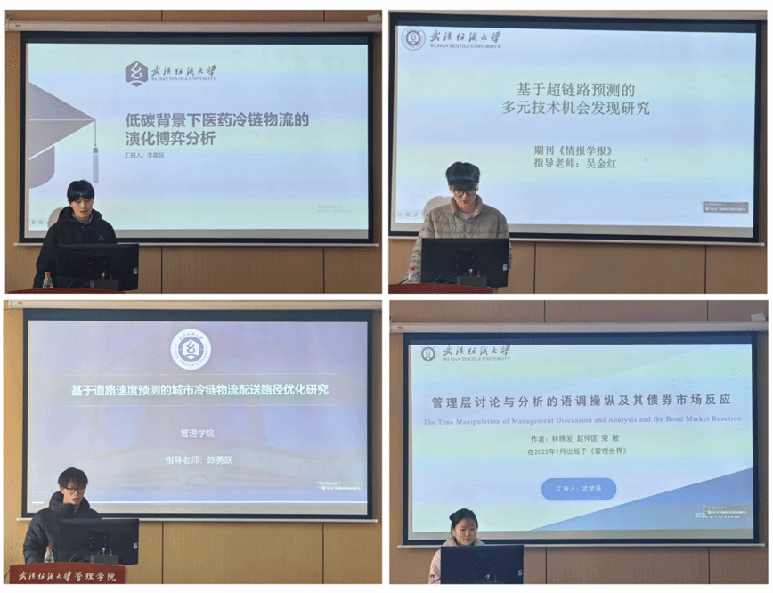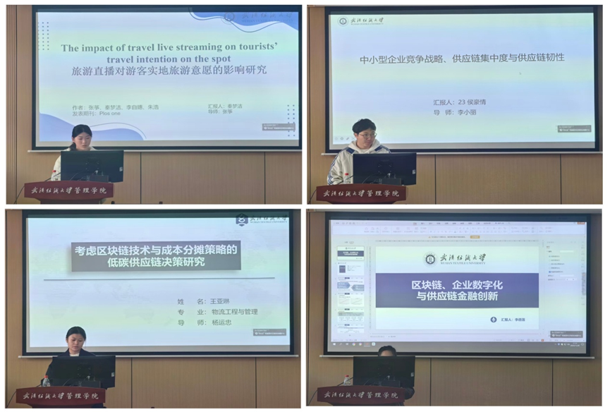 随后,秦梦洁同学汇报了论文《The impact of travel live streaming on tourists’ travel intention on the spot》基于SOR框架,通过文本挖掘与结构方程模型,揭示主播特质与内容特征对游客决策的双路径作用。侯豪情同学通过《中小型企业竞争战略、供应链集中度与供应链韧性》分享基于资源基础观,提出“竞争战略-集中度-韧性”理论链,并引入竞争强度作为调节变量。接着,王亚琳同学汇报了《考虑区块链溯源技术与成本分摊策略的低碳供应链决策研究》详细分析了区块链技术投入下的成本分摊契约,探讨不同分摊结构对供应链协调的优化作用。最后,李蓓莲同学聚焦《区块链、企业数字化与供应链金融创新》论证区块链共识机制如何通过信息质量提升,推动数字供应链金融成为普惠性融资工具。