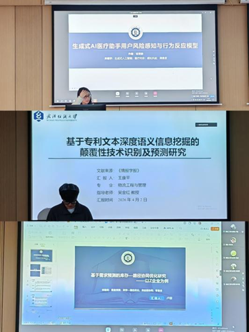 陈超同学分享的论文《基于时间窗和多仓温控的生鲜商品配送车辆路径优化问题》针对生鲜配送痛点构建双目标路径优化模型,设计CW-NSGA-II混合算法,验证后实现车辆数和运营成本的大幅降低,为生鲜配送提供决策支持。胡梦媛同学汇报了论文《信息源整合对用户参与和贡献的影响:在线知识共享社区的自然实验》,以知乎自然实验为背景,发现平台整合异质内容的信息源呈现方式,会因认知压力、激励削弱等原因降低用户的参与度与贡献量。严雨露同学汇报的论文《具身智能道德能力量表开发及其效应研究》,运用扎根理论开发具身智能道德能力量表,证实其含三大维度且正向影响消费者使用意愿,能力与温暖感知起中介作用、社会影响起调节作用,为伦理治理提供支撑。