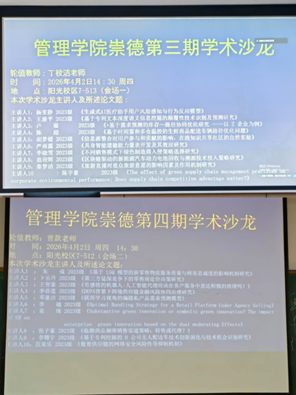 2026年4月2日下午,管理学院2026年第3、4期“崇德”学术沙龙在阳光校区7号教学楼512和513会议室成功举办。在本期学术沙龙活动中,同学们带来了精彩的学术分享,丁校洁老师和曾款老师受邀参与此次学术沙龙并发表点评。